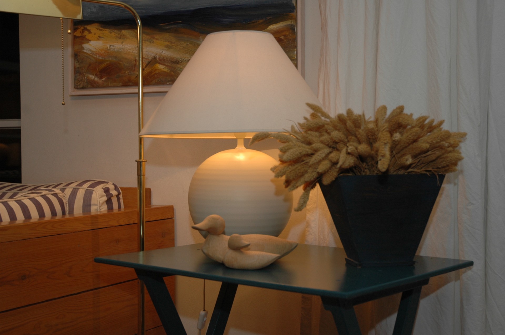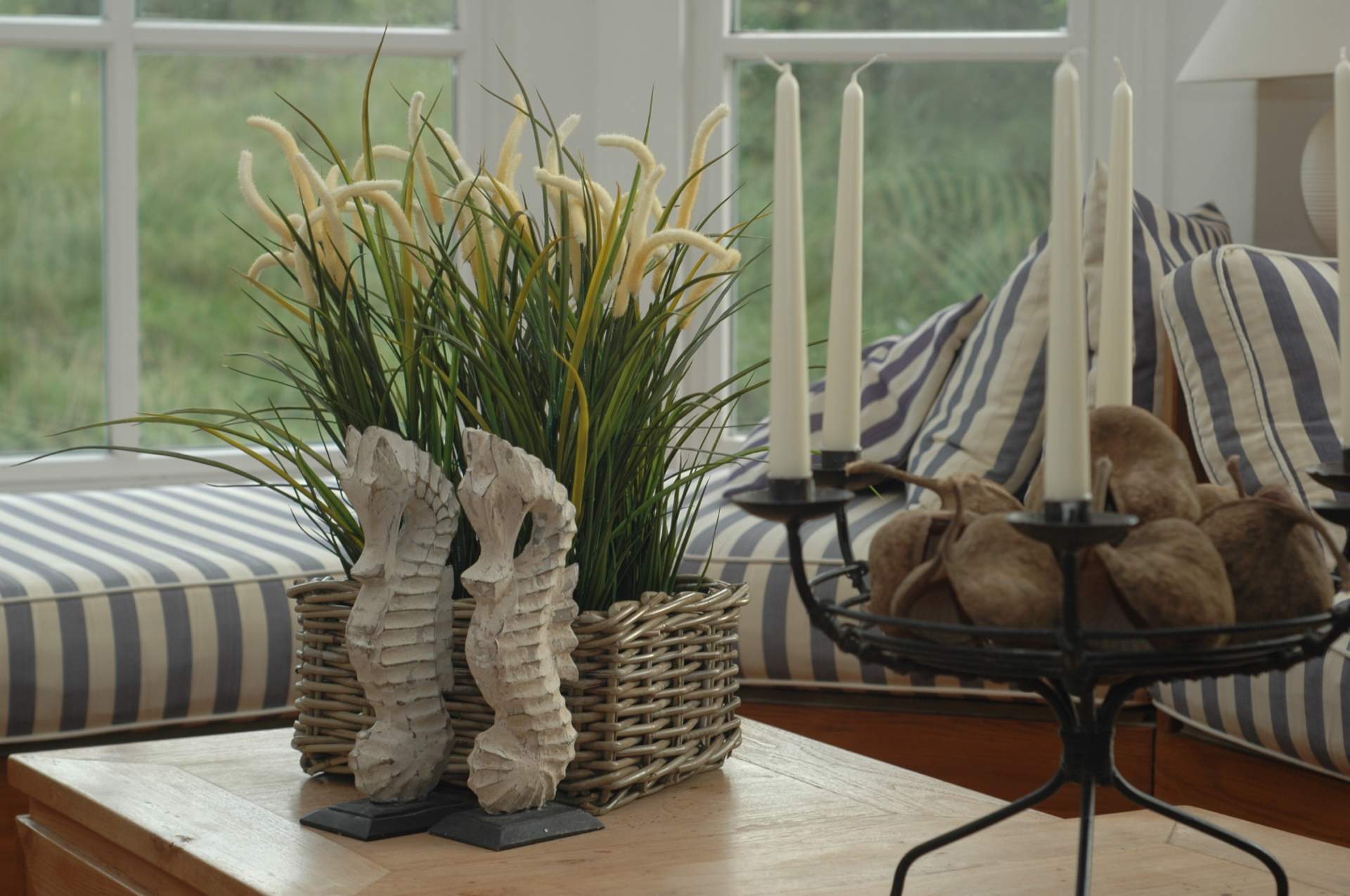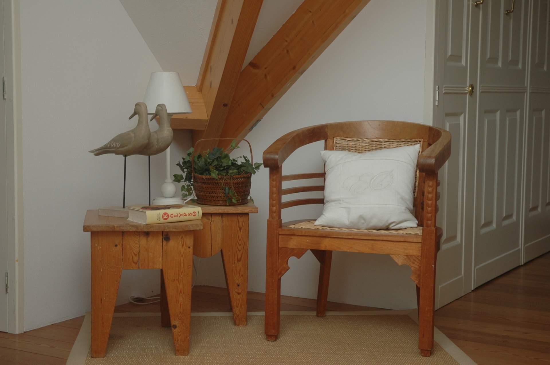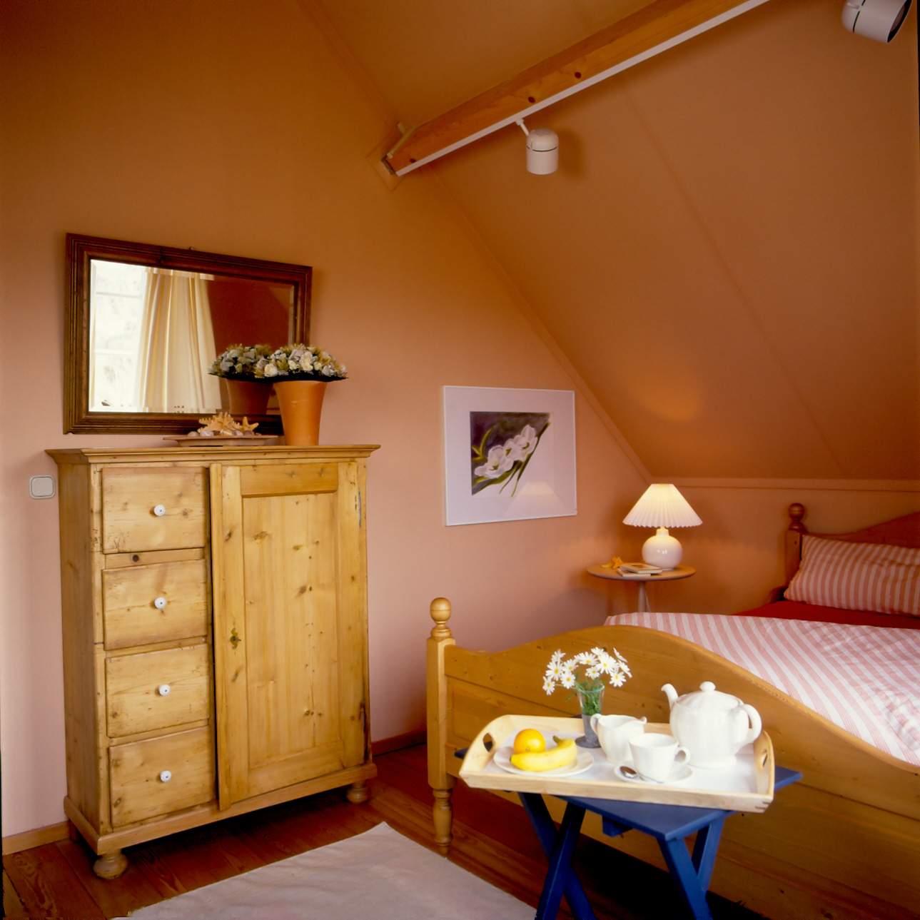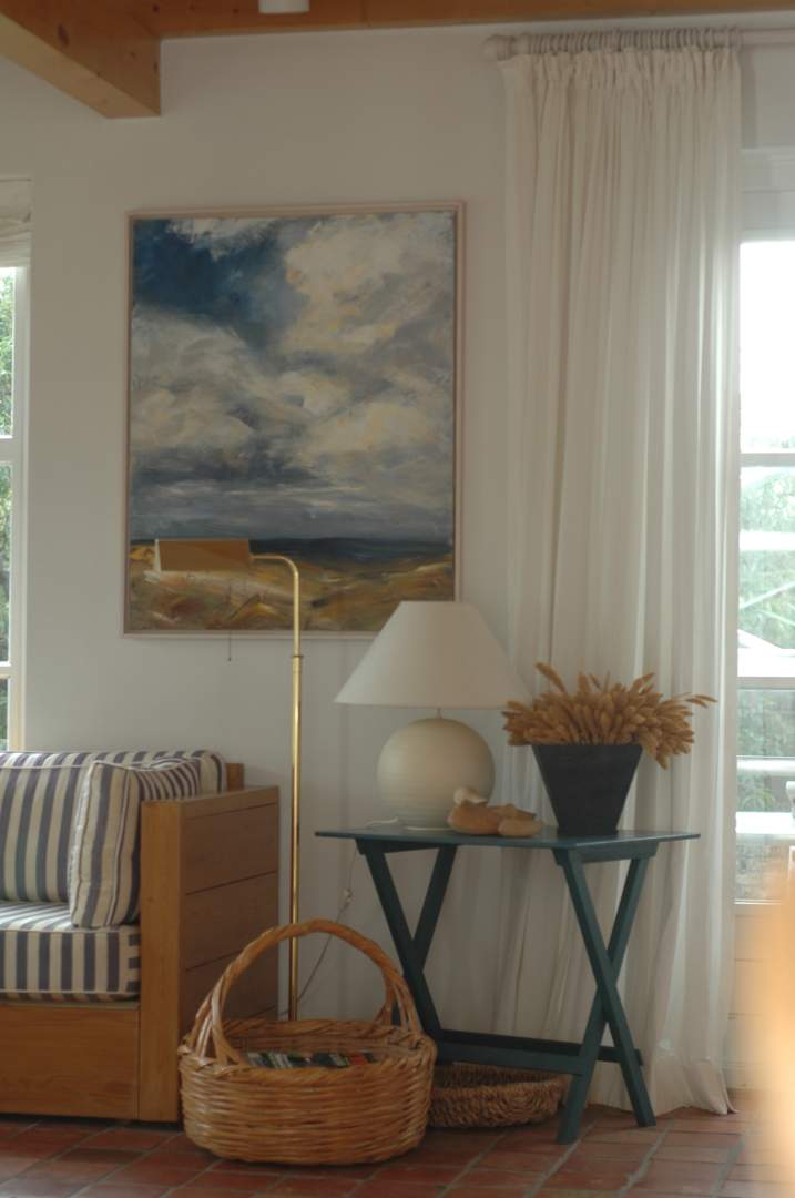 Jedes Schlafzimmer hat ein besonderes Farbthema: Meeresblau, Lachs, Dünengrasgrün und Sonnengelb. Die Bettwäsche ist dazu passend abgestimmt. Die vielen Gemälde, die man im Haus findet, sind Originale der Hausherrin.